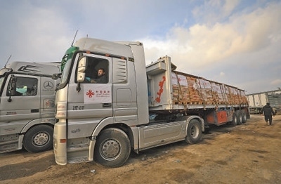 12月17日,載有中國援助的人道主義物資的貨車抵達凱雷姆沙洛姆口岸加沙地帶一側(cè)。亞西爾·庫迪攝(新華社發(fā))