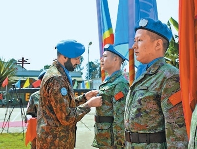 7月25日,剛果(金)南基伍省布卡武市中國半島營區(qū)。在高高飄揚的聯(lián)合國旗幟和中國、剛果(金)兩國國旗下,中國第二十六批赴剛果(金)維和部隊全體官兵被授予聯(lián)合國“和平勛章”。