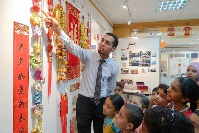 一位埃及青年正認(rèn)真向圍在身邊的學(xué)生們講解中國傳統(tǒng)文化中的十二生肖。他身穿白色襯衫,系著條紋領(lǐng)帶,學(xué)生們仰起頭,專心致志地聆聽講解。這位埃及青年便是時(shí)年28歲的阿巴斯。作為開羅中國文化中心主任助理,他經(jīng)常在這里向埃及學(xué)生和民眾介紹中國的文房四寶和京劇臉譜,講解中國的傳統(tǒng)節(jié)日和風(fēng)景名勝,并帶領(lǐng)孩子們做手工,燈籠、風(fēng)箏和寫對聯(lián)往往是他們最喜愛的內(nèi)容。在當(dāng)年埃及的動(dòng)蕩時(shí)局下,中國文化中心照常對外開放,各種活動(dòng)有序開展。首屆大使杯“魅力埃及,多彩中國”攝影大賽作品展就吸引了上百名開羅市民前往參觀。