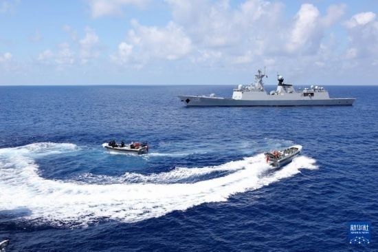 中國海軍第45批護(hù)航編隊(duì)烏魯木齊艦、東平湖艦為中國漁船護(hù)航(2023年10月20日攝)。新華社發(fā)(王遠(yuǎn)方攝)