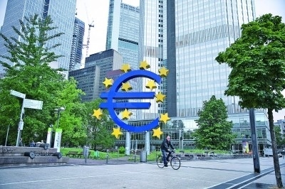 7月27日,一名男子騎車經(jīng)過(guò)德國(guó)法蘭克福的歐元標(biāo)志。新華社發(fā)