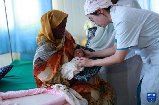 2023年2月22日,中國援蘇丹醫(yī)療隊(duì)婦產(chǎn)科醫(yī)生劉韡在蘇丹阿布?xì)W舍醫(yī)院的病房為一名新生兒做檢查。新華社發(fā)(中國援蘇丹醫(yī)療隊(duì)供圖)