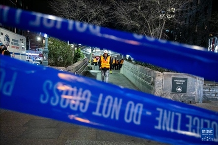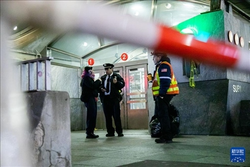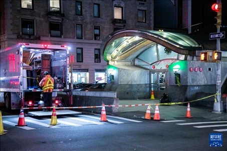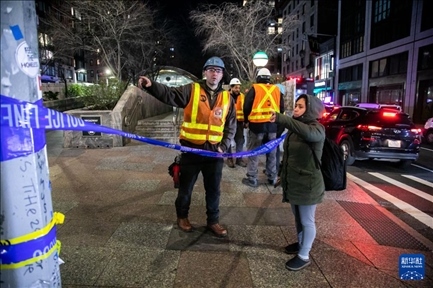 1月4日,在美國紐約,工作人員在列車脫軌事故現(xiàn)場外工作。新華社發(fā)(郭克攝)