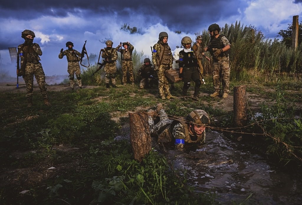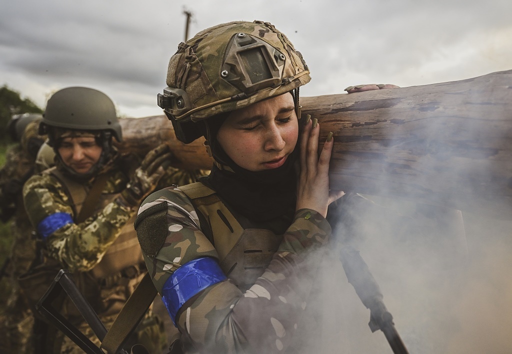 當地時間2023年7月15日,扎波羅熱地區(qū),烏克蘭女兵在不同的戰(zhàn)斗場景中進行訓練。