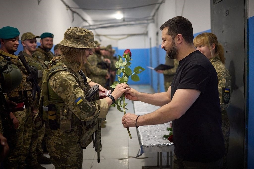 當地時間2023年9月4日,頓涅茨克地區(qū),烏克蘭總統(tǒng)弗拉基米爾·澤連斯基(右)在視察前線指揮所,并送女兵玫瑰花。