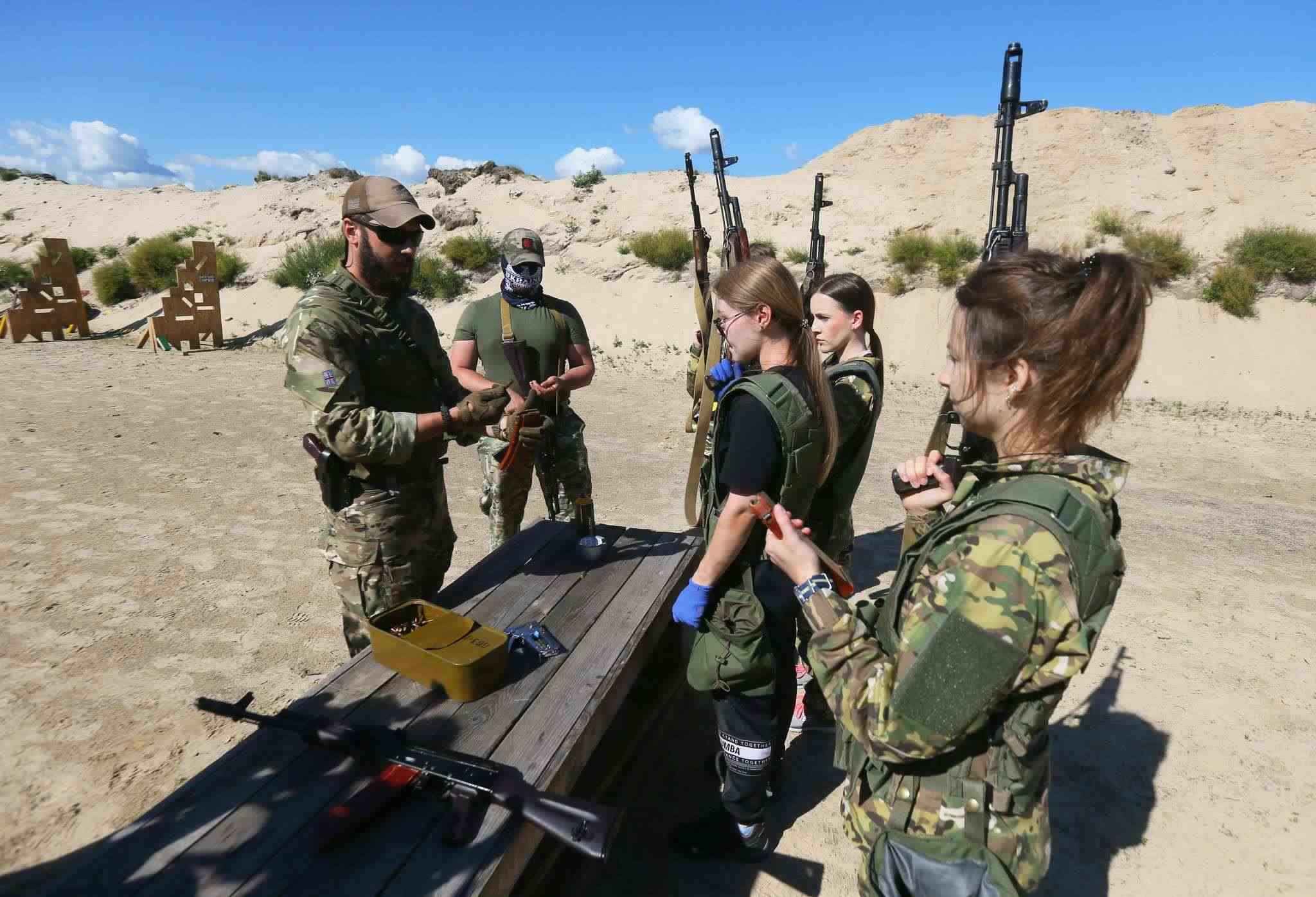 當地時間2023年7月12日,烏克蘭基輔,烏克蘭女兵學習使用槍械。