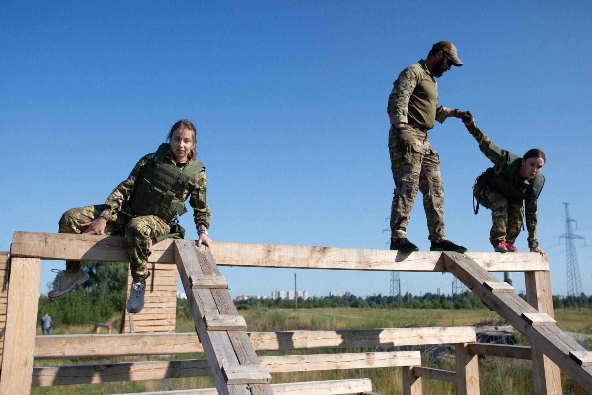 當地時間2023年7月12日,烏克蘭基輔,烏克蘭女兵身穿新款野戰(zhàn)服參加軍事訓練。