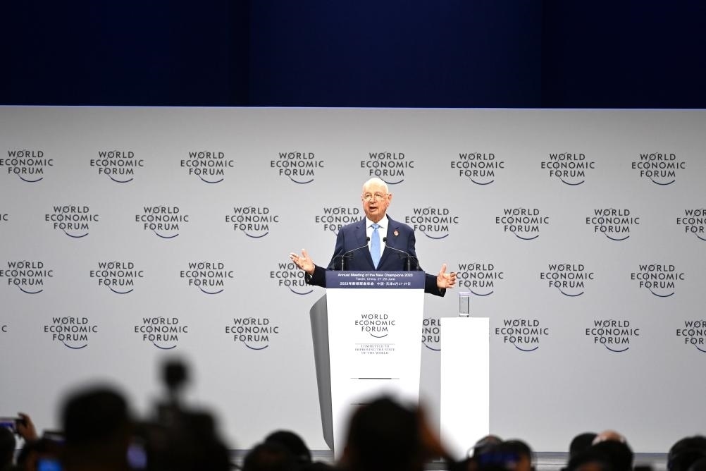 2023年6月27日,世界經濟論壇主席施瓦布在第十四屆夏季達沃斯論壇開幕式上發(fā)言。新華社記者趙子碩攝