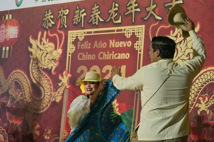 2月17日,在巴拿馬奇里基省首府戴維市,一群身穿巴拿馬民族服飾的舞者在奇里基春節(jié)慶?;顒?dòng)上表演。新華社記者陳昊佺攝