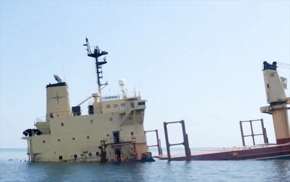 這張拍攝日期不明的照片顯示了英國(guó)貨輪“魯比馬爾”號(hào)沉沒(méi)前的景象。新華社發(fā)(也門政府供圖)
