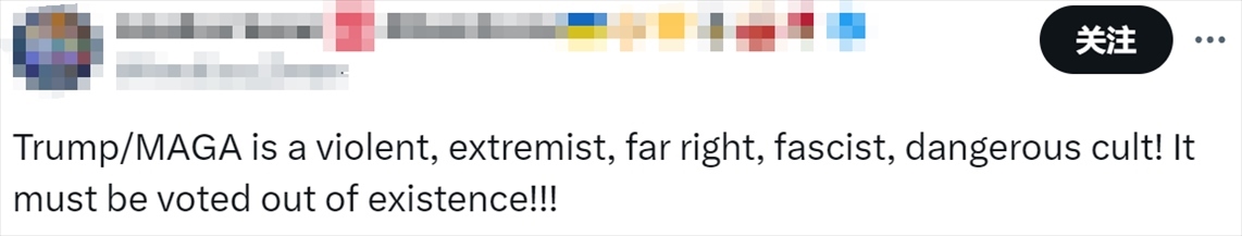 有人喊話:“特朗普/MAGA(即讓美國再次偉大口號)是一個(gè)暴力的、極端的、極右翼的、法西斯的、危險(xiǎn)的邪教!一定要用投票讓它不復(fù)存在!?。 ?/p>