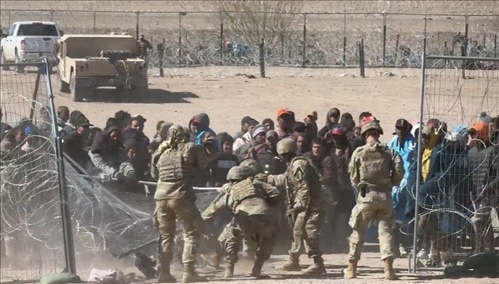 視頻畫面顯示,大批成年男性沖破州政府設(shè)置的鐵絲網(wǎng),將得州國(guó)民警衛(wèi)隊(duì)的一些士兵撞倒,并跑向邊界墻。 現(xiàn)場(chǎng)一片混亂,可以聽(tīng)到有士兵對(duì)移民大叫“滾回去!”