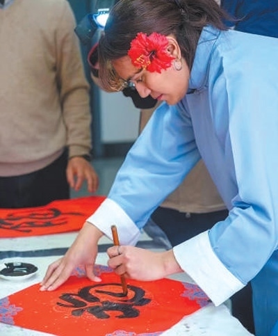 安雅在學(xué)校為留學(xué)生舉辦的新春活動(dòng)上用毛筆書(shū)寫(xiě)“福”字。受訪者供圖