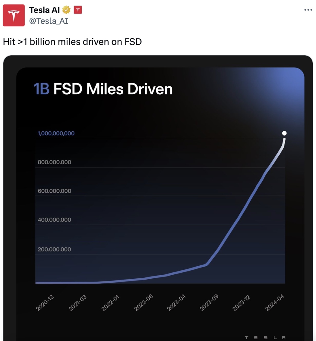 特斯拉還宣布,其FSD的行駛里程已經(jīng)超過了10億英里。