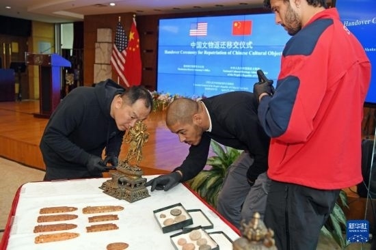 4月17日,在美國紐約中國駐紐約總領(lǐng)館,工作人員點交中國流失文物藝術(shù)品。新華社記者 李睿 攝