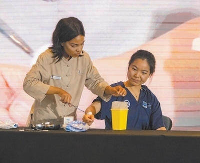 在2023年舉行的第二十二屆“漢語(yǔ)橋”世界大學(xué)生中文比賽南非賽區(qū)決賽中,來(lái)自西開普大學(xué)中醫(yī)孔子學(xué)院的學(xué)生希諾(左)展示針灸治療。 本報(bào)記者 鄒 松攝