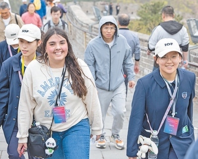 馬斯卡廷中學(xué)學(xué)生(前左)登上北京八達(dá)嶺長(zhǎng)城。
