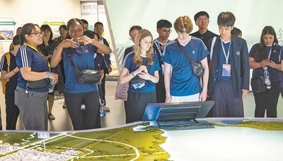 在河北雄安新區(qū)“雄安印象”展館,馬斯卡廷中學(xué)學(xué)生與石家莊外國(guó)語學(xué)校學(xué)生觀看雄安新區(qū)規(guī)劃示意模型。