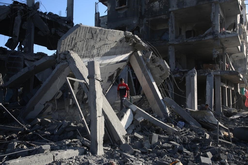 ?4月20日,在加沙地帶南部城市拉法,巴勒斯坦人查看被以軍空襲的建筑。新華社發(fā)(哈立德·奧馬爾攝)