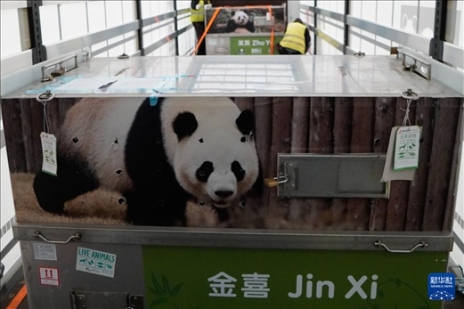 4月29日,在西班牙馬德里,工作人員轉(zhuǎn)運(yùn)大熊貓“金喜”。新華社發(fā)(西班牙馬德里動(dòng)物園供圖)