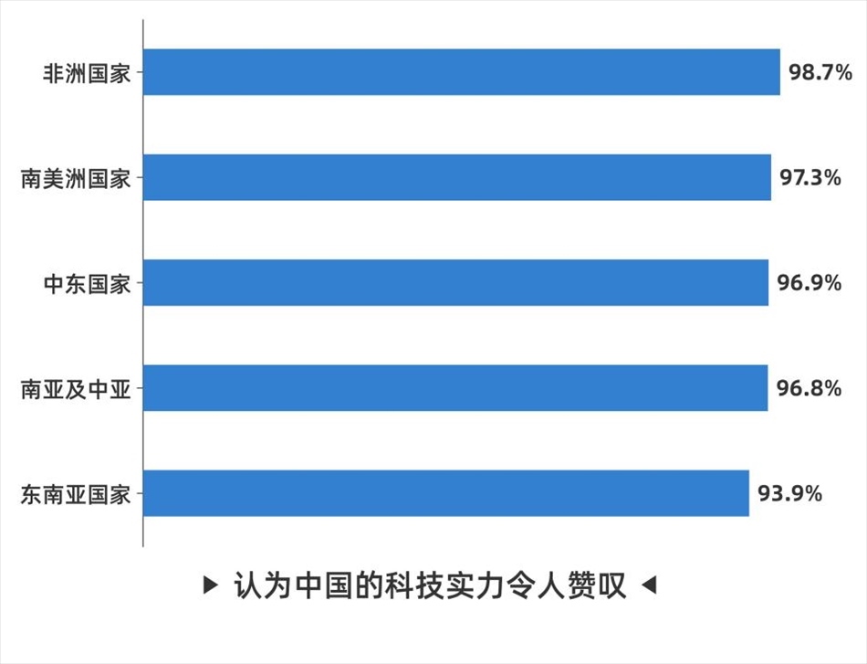 在科技表現(xiàn)方面,中國(guó)的科技實(shí)力同樣受到全球受訪者認(rèn)可。其中,92.3%的受訪者認(rèn)為中國(guó)的科技實(shí)力令人贊嘆,排名前五位的分別是非洲國(guó)家受訪者(98.7%)、南美洲國(guó)家受訪者(97.3%)、中東國(guó)家受訪者(96.9%)、南亞及中亞國(guó)家受訪者(96.8%)以及東南亞國(guó)家受訪者(93.9%)。