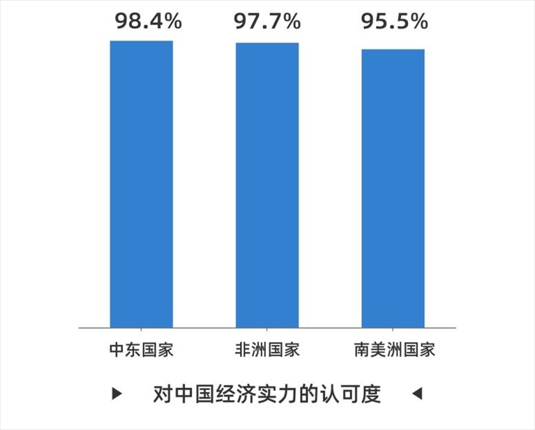 在經(jīng)濟(jì)表現(xiàn)方面,92.3%的受訪者稱贊中國(guó)經(jīng)濟(jì)實(shí)力強(qiáng)勁,這一調(diào)查結(jié)果與去年基本持平。其中,中東國(guó)家受訪者的認(rèn)可度達(dá)到98.4%,非洲國(guó)家和南美洲國(guó)家受訪者的認(rèn)同度分別為97.7%和95.5%。