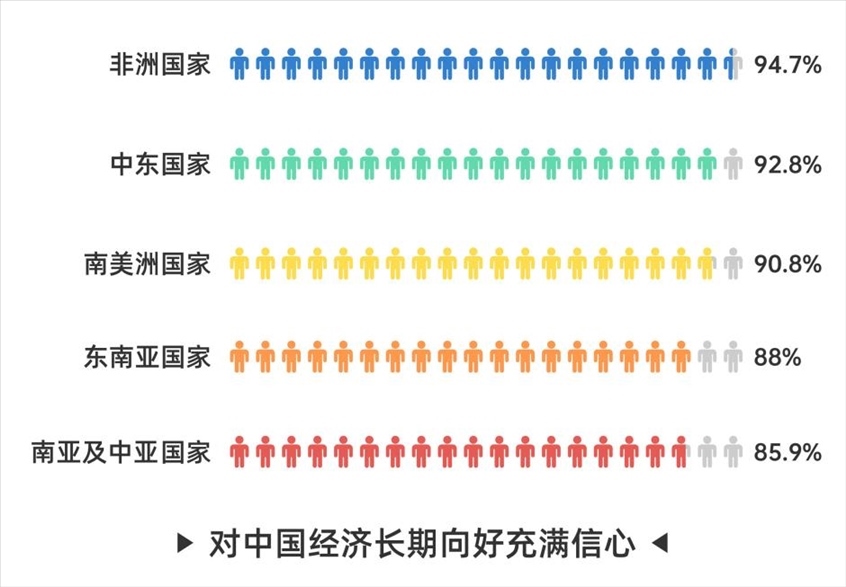 此外,81.3%的受訪者對(duì)于中國(guó)經(jīng)濟(jì)長(zhǎng)期向好充滿信心,較去年上升7.1個(gè)百分點(diǎn),認(rèn)同度排在前五位的分別是非洲國(guó)家受訪者(94.7%)、中東國(guó)家受訪者(92.8%)、南美洲國(guó)家受訪者(90.8%)、東南亞國(guó)家受訪者(88%)和南亞及中亞國(guó)家受訪者(85.9%)。