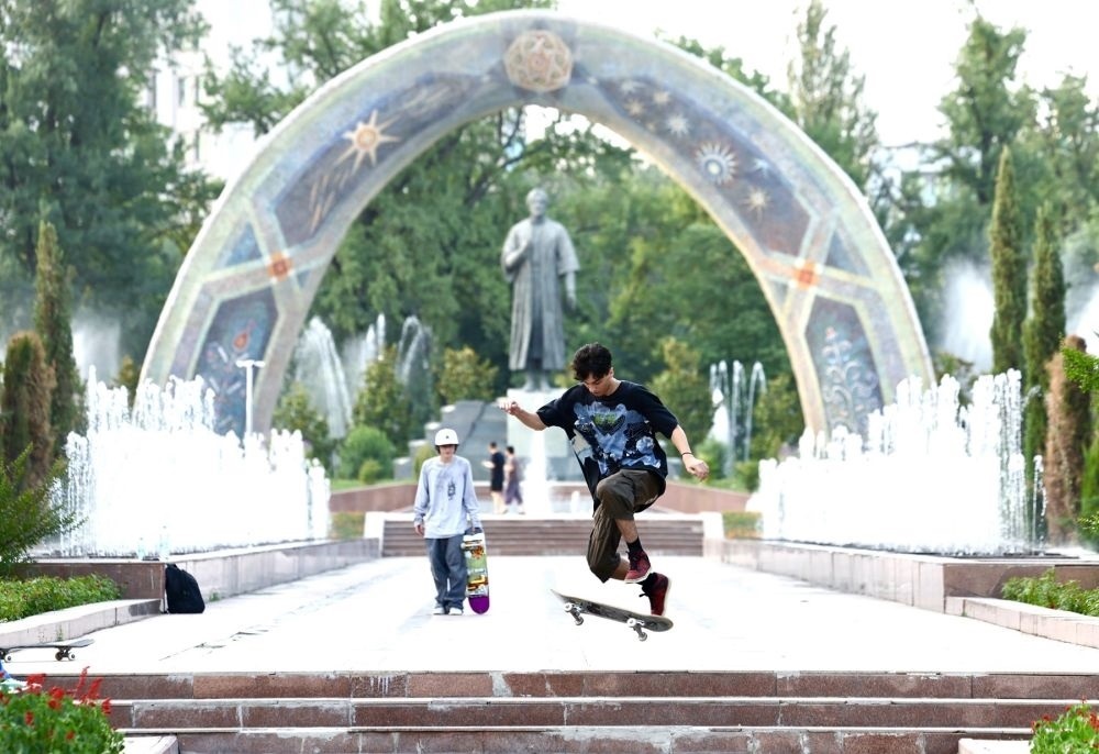 ↑青少年在杜尚別的魯達(dá)基公園練習(xí)滑板。 新華社記者 姚大偉 攝