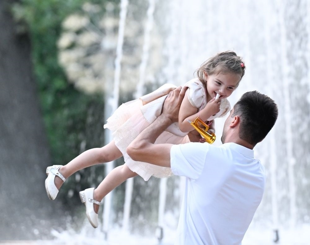 ↑一名男子在杜尚別的魯達(dá)基公園內(nèi)與孩子玩耍。 新華社記者 申宏 攝