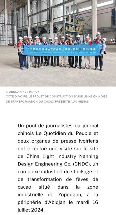 7月16日,人民日報與兩家科特迪瓦新聞機構記者一行參觀了由中國輕工業(yè)南寧設計工程有限公司總承包的可可加工及可可豆倉庫建設項目,該項目坐落在阿比讓郊區(qū)的約普貢工業(yè)區(qū)。該公司負責人指出,該項目綜合體計劃于2024年年底完工,包括一個可加工5萬噸可可豆的工廠、可存儲14萬噸可可豆的倉庫以及培訓中心、行政大樓等?!钥铺氐贤甙⒈茸尵W(wǎng)報道