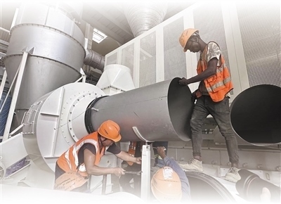 在科特迪瓦阿比讓可可加工廠內(nèi),中科工作人員正在安裝調(diào)試設備??铺氐贤甙⒈茸尵W(wǎng)記者 希普林·夸西攝