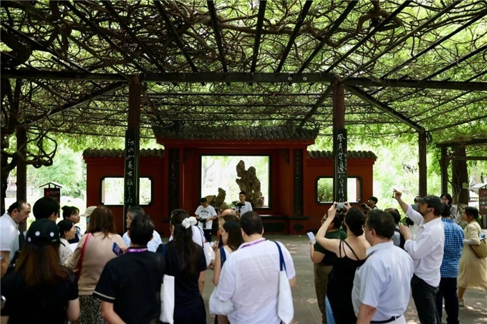 桂湖公園內(nèi)最著名的古建筑之一是楊升庵祠堂。楊慎,號升庵,是從新都走出的明代四川唯一狀元,他剛正立朝、嚴(yán)謹(jǐn)治學(xué),被稱為明代三大才子之首,“滾滾長江東逝水,浪花淘盡英雄”便出自他的筆下。公園工作人員向考察團(tuán)介紹,桂湖原是楊升庵的書苑,在這里,他沿湖植歸,摘種荷花,培植風(fēng)景。作為“四川首批十大歷史名人”之一,楊升庵“為國為民,一片丹心”的家國情懷和“好學(xué)窮理,精思深索”的治學(xué)精神已成為新都人文精神的象征。