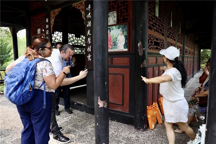 紫藤纏繞,荷葉連綿,位于四川成都新都區(qū)的桂湖公園一片綠意盎然。桂湖公園始建于隋唐時期,是一座自然環(huán)境幽雅、人文底蘊(yùn)深厚的古典園林。8月30日,2024年“一帶一路”媒體合作論壇拉美媒體采訪團(tuán)來到這里參觀。