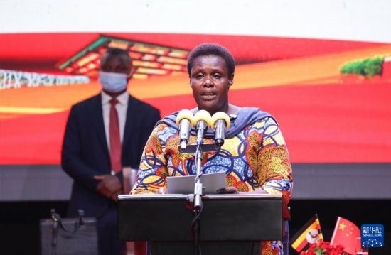 9月25日,烏干達(dá)副總統(tǒng)杰西卡·阿盧波在坎帕拉舉行的慶祝中華人民共和國(guó)成立75周年招待會(huì)上致辭。新華社發(fā)(阿佳拉·納瓦達(dá)攝)