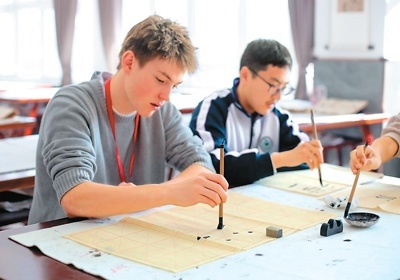 圖為活動期間,來自美國得克薩斯州圣史蒂芬圣公會學(xué)校的學(xué)生查爾斯·錢寧·達(dá)根(左)在河北衡水中學(xué)學(xué)習(xí)書法。