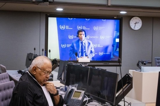 這是3月14日在荷蘭海牙拍攝的國際刑事法院第一預審庭現場,菲律賓前總統(tǒng)杜特爾特以視頻連線方式出席。新華社發(fā)(國際刑事法院供圖)