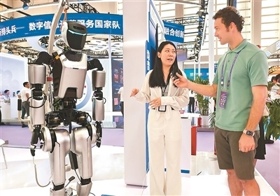 在浙江省寧波國際會展中心的第十四屆智博會現(xiàn)場,一位外國朋友采訪人形機器人展商。