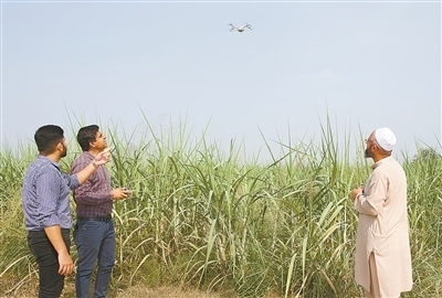 中國(guó)—巴基斯坦人工智能智慧農(nóng)業(yè)實(shí)驗(yàn)室研發(fā)人員運(yùn)用無(wú)人機(jī)定期巡檢畫面,通過(guò)人工智能分析,實(shí)時(shí)向農(nóng)戶反饋?zhàn)魑锷L(zhǎng)情況。