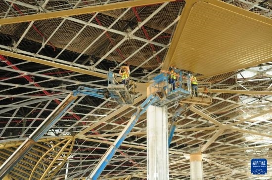 4月8日,建筑工人在伊拉克濟加爾省納西里耶國際機場項目主航站樓內部施工作業(yè)。新華社記者 段敏夫 攝