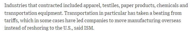 文章指出,美國制造業(yè)活動萎縮的行業(yè)主要包括服裝、紡織品、紙制品、化工產(chǎn)品和運(yùn)輸業(yè)。文章表示,雖然當(dāng)前美國工廠產(chǎn)量有所增加,但未售出的庫存卻急劇增加。需求增長放緩,這在出口市場體現(xiàn)尤為明顯,而受關(guān)稅影響,出口市場的前景更加暗淡。
