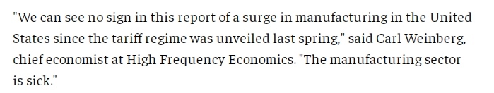 文章指出,美國政府曾辯稱,加征關(guān)稅是保護(hù)美國國內(nèi)制造業(yè)的必要之舉,但經(jīng)濟(jì)學(xué)家則認(rèn)為,由于包括勞動力短缺在內(nèi)的結(jié)構(gòu)性問題,美國制造業(yè)已無法恢復(fù)昔日輝煌。文章援引高頻經(jīng)濟(jì)咨詢公司首席經(jīng)濟(jì)學(xué)家卡爾·溫伯格(Carl Weinberg)的話表示,“從(ISM)這份報告中,我沒有看到自關(guān)稅政策出臺以來,美國制造業(yè)出現(xiàn)任何增長的跡象,美國制造業(yè)已經(jīng)病了?!?/p>