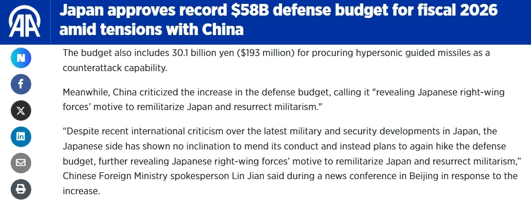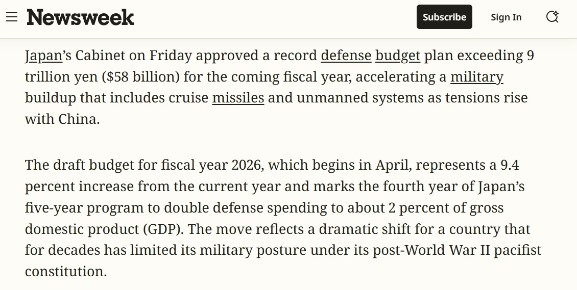 日本政府12月26日批準(zhǔn)2026財年(2026年4月至2027年3月)預(yù)算案,其中防衛(wèi)預(yù)算超9萬億日元,再創(chuàng)歷史新高。其展現(xiàn)出的日本負面軍事動向,受到國際媒體關(guān)注。