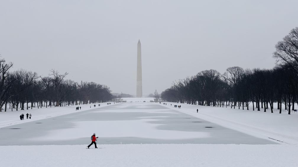 1月25日,人們?cè)诿绹锥既A盛頓林肯紀(jì)念堂倒影池旁的雪中行走。新華社記者徐劍梅攝
