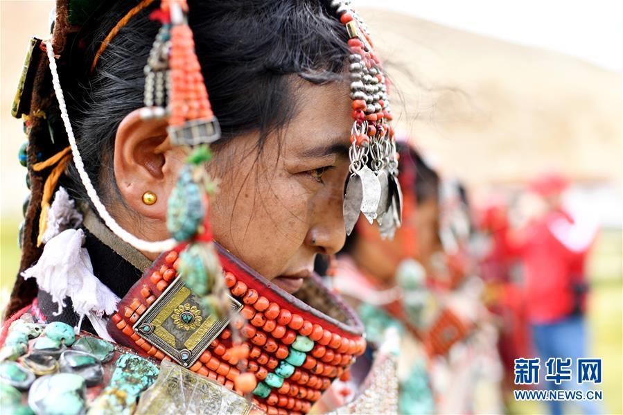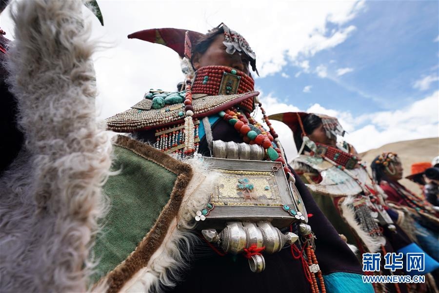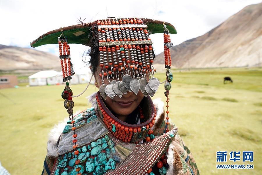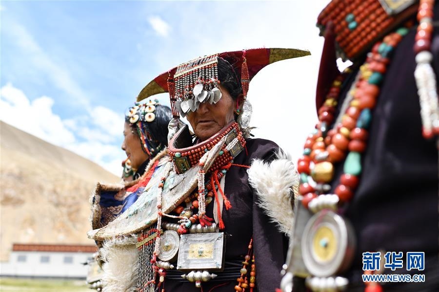 這是7月28日拍攝的身著普蘭服飾的普蘭縣科迦村村民。在西藏阿里地區(qū)普蘭縣,至今保留著獨特的藏族服飾——普蘭服飾。據(jù)了解,普蘭服飾已有1000多年的歷史,其中最精美、最獨特的是婦女的“孔雀”服飾,一套重達20多公斤,裝飾有黃金、白銀、蜜蠟、珊瑚、綠松石等,堪稱“穿在身上的千年歷史”。新華社記者詹彥攝
