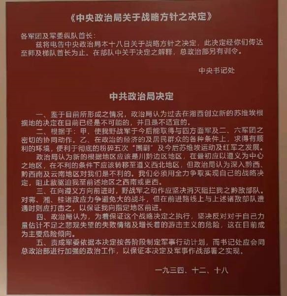 “鑒于目前所形成之情況,政治局認為過去在湘西創(chuàng)立新的蘇維埃根據(jù)地的決定在目前已經(jīng)是不可能的,并且是不適宜的”。