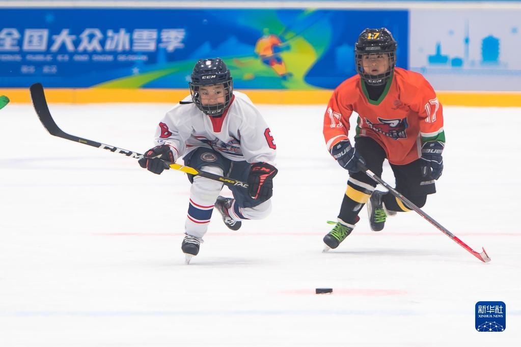 2021年12月19日,在湖北武漢,小球員在“滑向2022”全國青少年冰球系列賽(武漢站)的比賽中。新華社記者 肖藝九 攝