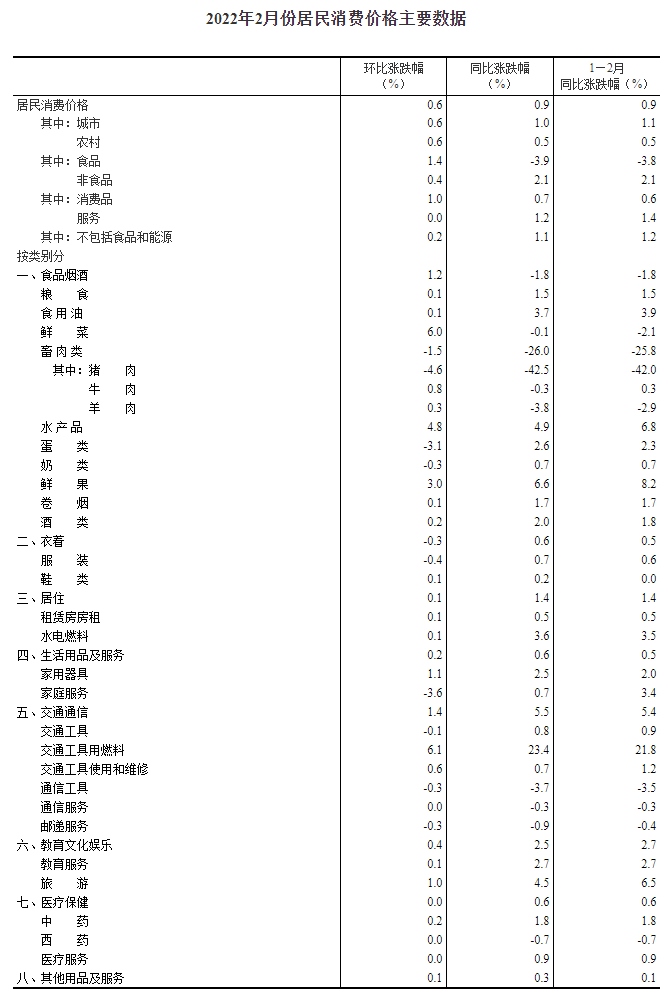 2022年2月份居民消費價格主要數據