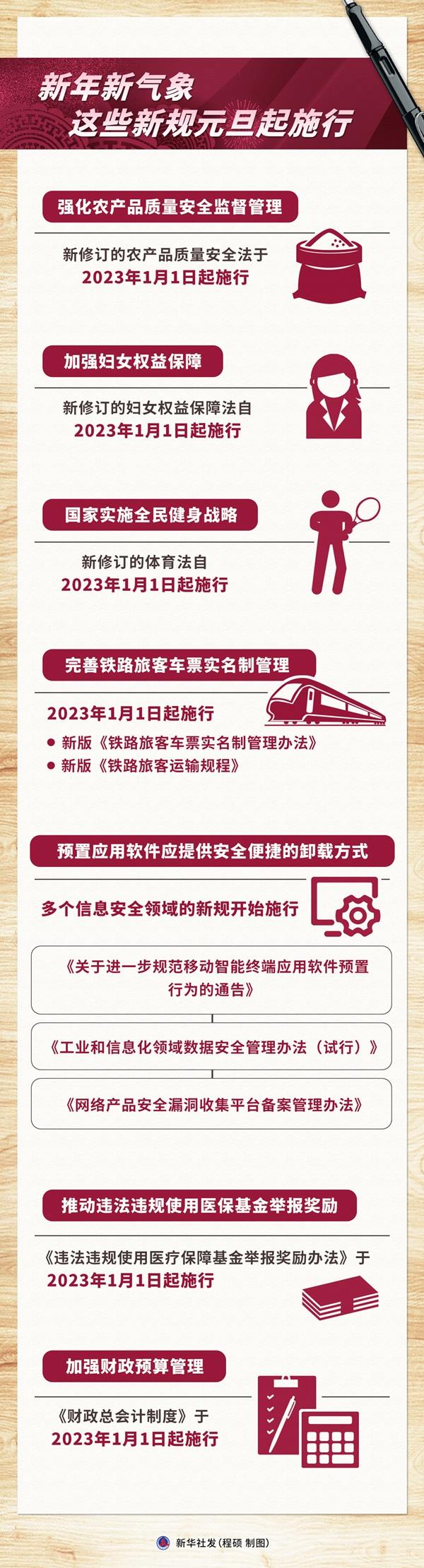 當(dāng)2023年的鐘聲敲響,一批元旦起施行的新規(guī),將為我們帶來(lái)新年新氣象。新修訂的農(nóng)產(chǎn)品質(zhì)量安全法全鏈條保障“舌尖上的安全”;新修訂的婦女權(quán)益保障法進(jìn)一步促進(jìn)男女平等;新修訂的體育法構(gòu)建全民健身公共服務(wù)體系……法治的溫度,彰顯社會(huì)的進(jìn)步。