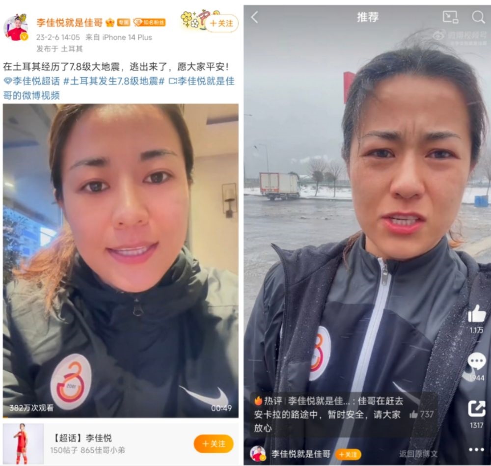 今年1月,李佳悅從上海農(nóng)商銀行女足轉(zhuǎn)會土耳其加拉塔薩雷女足。她6日于個人社交媒體賬號上發(fā)布兩條視頻,表示地震發(fā)生前自己正隨隊在震中附近區(qū)域比賽,目前,她正在趕往土耳其首都安卡拉的途中。