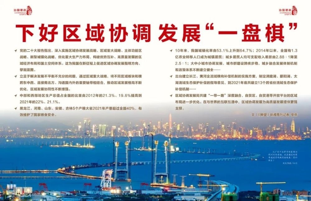 ◆ 黨的二十大報告指出,深入實施區(qū)域協(xié)調發(fā)展戰(zhàn)略、區(qū)域重大戰(zhàn)略、主體功能區(qū)戰(zhàn)略、新型城鎮(zhèn)化戰(zhàn)略,優(yōu)化重大生產力布局,構建優(yōu)勢互補、高質量發(fā)展的區(qū)域經濟布局和國土空間體系。這為我國在新征程上促進區(qū)域協(xié)調發(fā)展指明方向、擘畫藍圖。